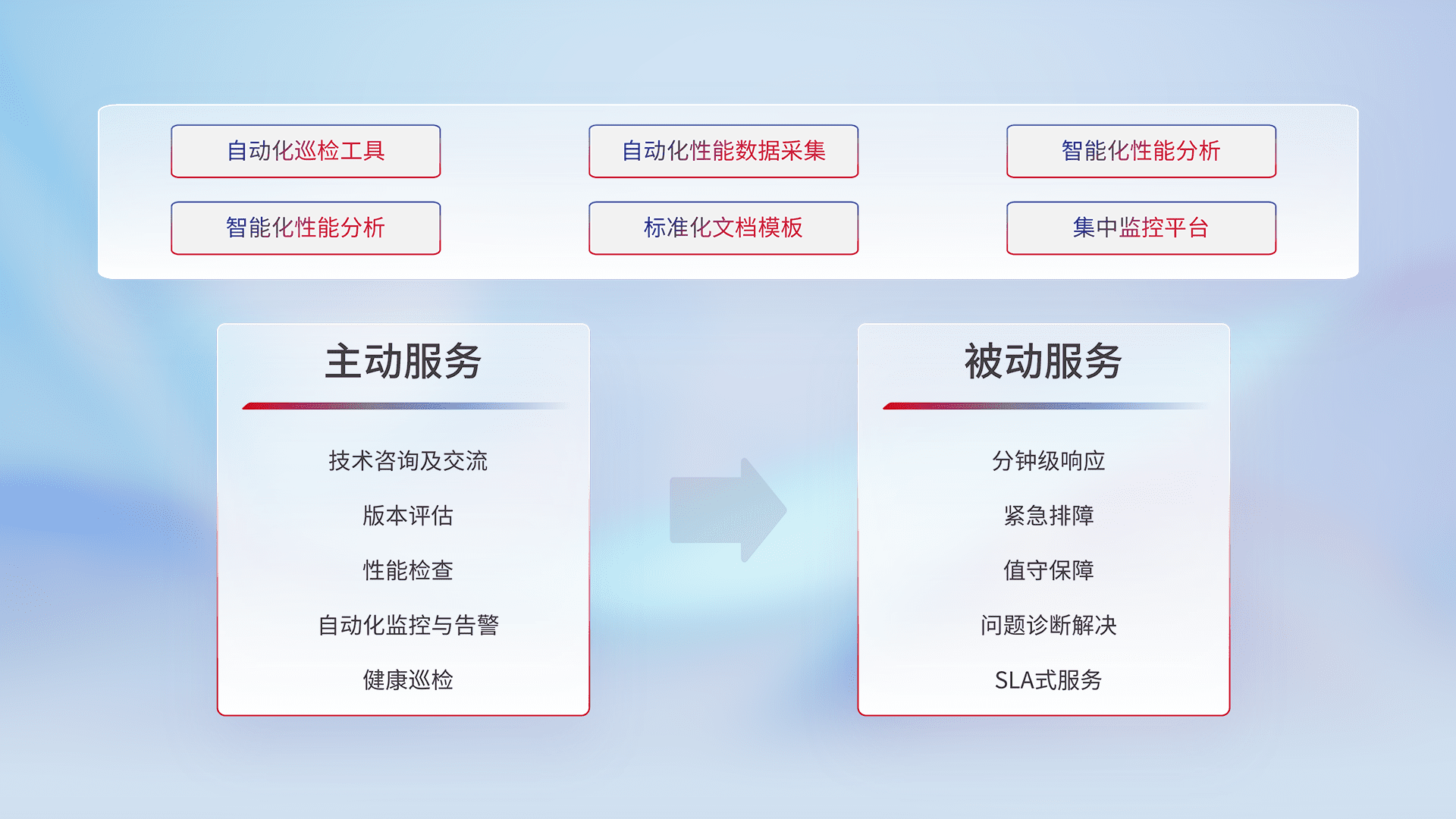 智能化工具和标准化文档,,,保障服务质量,,,提供主动服务(包含技术咨询、、版本评估、、、性能检查、、、、自动化监控与告警、、健康巡检)和被动服务包含(分钟级响应、、、紧急排障、、、、值守保障、、问题诊断解决、、SLA服务)。。