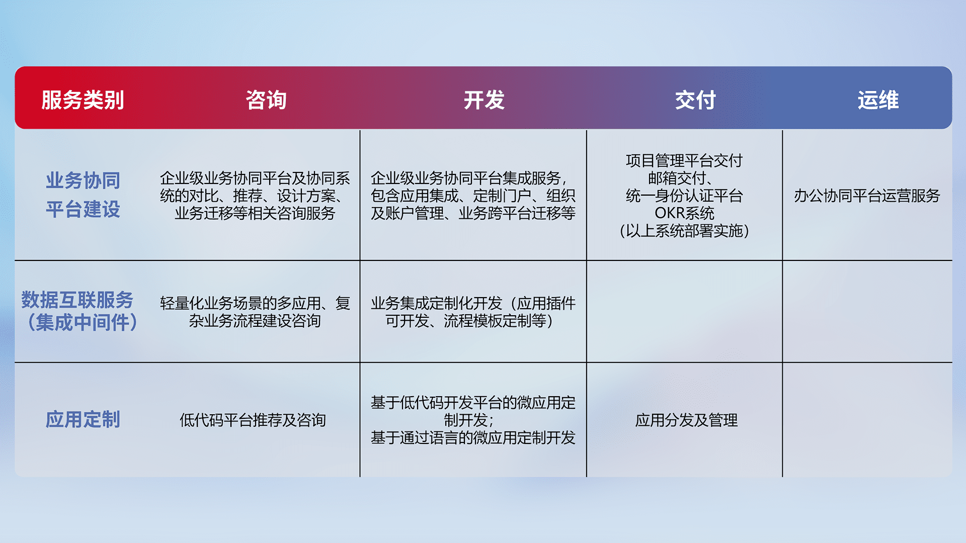 针对钉钉、、、、企微、、、、IDaas等平台级产品提供产品的规划、、、方案、、交付、、定制化开发等服务,,,,实现如统一协同办公、、、、智能客户服务、、、混合会议管理、、、、智能数据查询、、、、等业务场景,,,实现数字化转型。。。